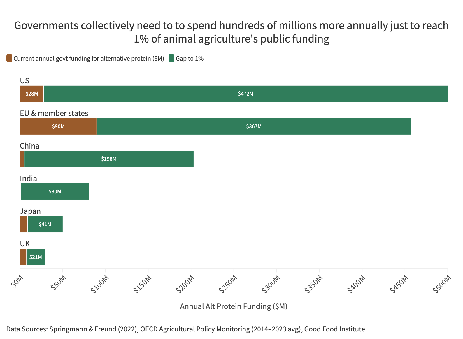 This funding disparity between animal agriculture and better alternatives shows up across every major agricultural economy. While alternative proteins account for roughly around 1% of global market share, they don't get close to 1% of the $156B that governments spend on animal products annually.
