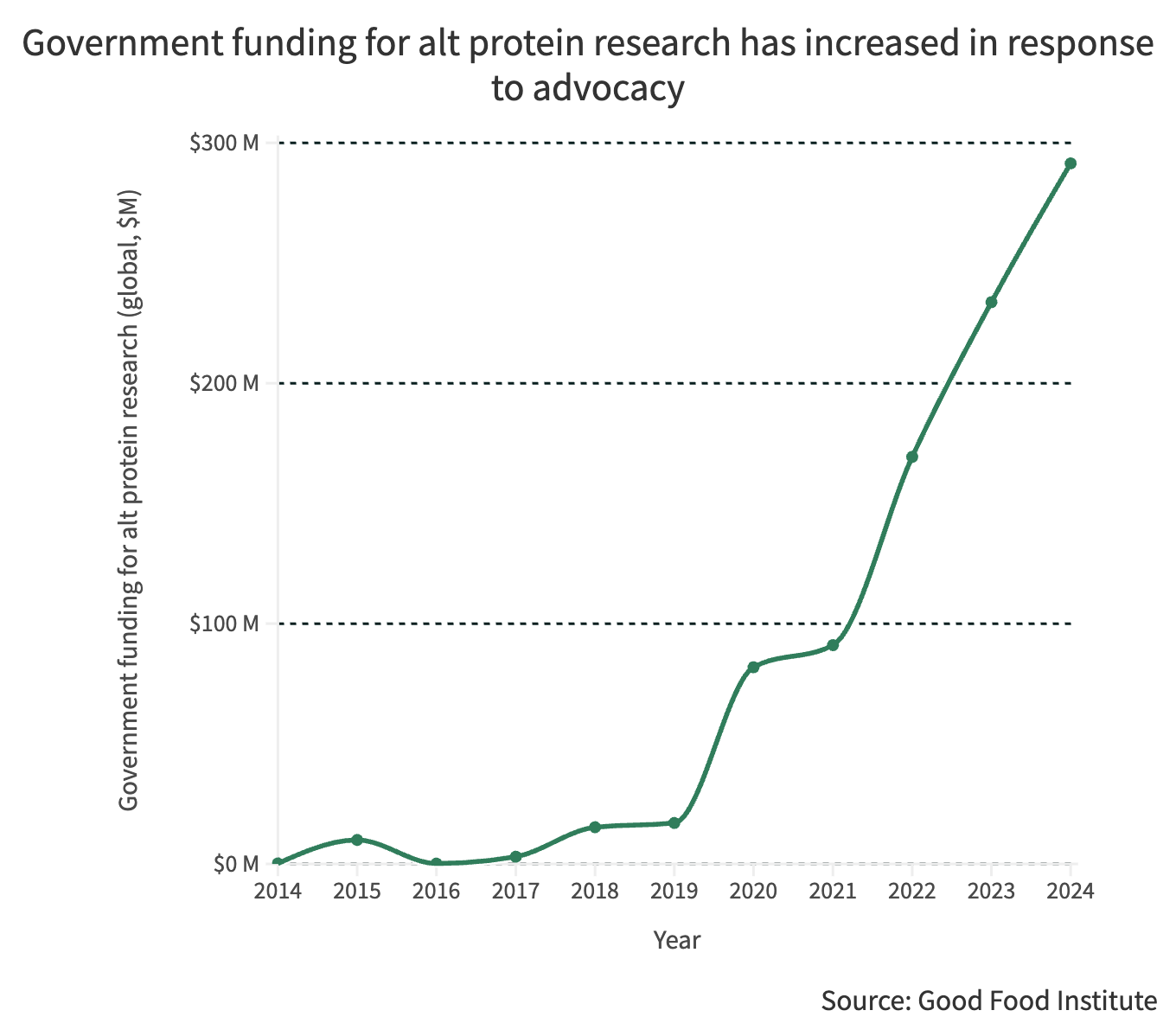 Second, we know it responds to advocacy. Ten years ago, governments were spending almost nothing on alternative protein research. That changed because advocates and researchers made the case that protein diversification is a public good. Since 2014, global public funding for alternative protein R&D has grown from essentially zero to around $290 million in 2024, raising its share of agricultural R&D from 0% to about 1.8% (based on the most recent global data for 2024) [^ The broader 700:1 ratio above uses 10-year averages (2014–2023) for all agricultural spending, which smooths volatility and missing data, while these R&D figures reflect the most recent year (2024) of a rapidly expanding category. Taken together, they show a consistent pattern: governments are still investing hundreds of times more in maintaining the old food system than in building the new one—but the R&D share is finally starting to move. For a like-for-like comparison, average annual public R&D funding for alternative proteins between 2015 and 2024 was about $91 million, equal to 0.6 % of global public agricultural R&D on average, rising to 1.8 % in the most recent year.]